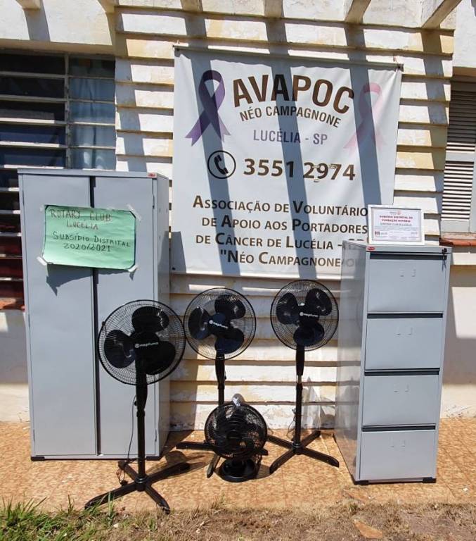 Através do projeto de Subsídio Distrital do Rotary Club de Lucélia, foi adquirido: 01 Armário de aço com 2 portas e chave, para guardar documentos; 01 Armário de aço tipo arquivo com 4 gavetas para guardar prontuários das pessoas atendidas; 03 Ventiladores tipo coluna para as salas de recepção, acolhimento e bazar solidário e 01 Ventilador de mesa para secretaria, a fim de amenizar o calor, que totalizam R$ 2.000,00 (dois mil reais).