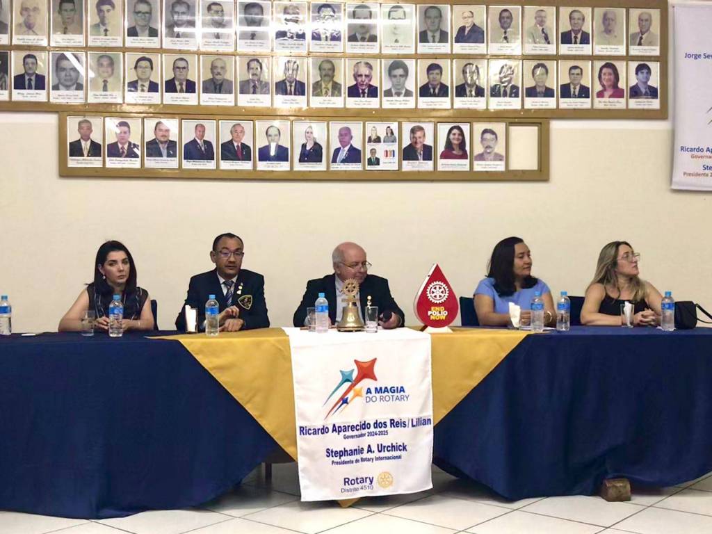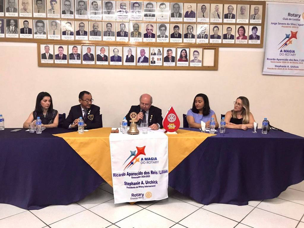 As 20h30min se iniciou a Reunião Festiva, ficando os serviços protocolares à cargo do Rotariano Romildo Bernardo, que inicialmente nominou e saudou os componentes da Mesa Diretora: Ao Centro, o Presidente do Rotary Club de Lucélia, Jorge Severo da Silva; a Direita do Presidente: Governador Distrital 2024-25, Ricardo Aparecido dos Reis; a Companheira do Governador Lilian Carla. A Esquerda do Presidente: A Representante da Prefeita Municipal e a Presidente do Lions Club de Lucélia Selma Aparecida Monteiro.