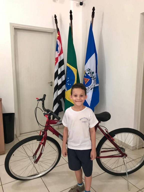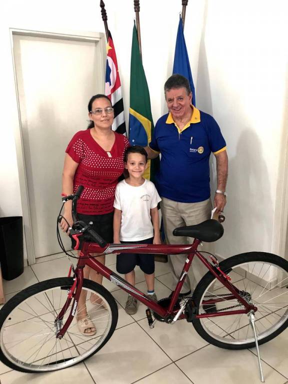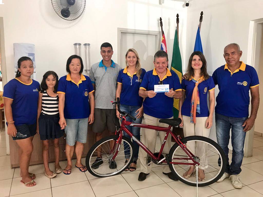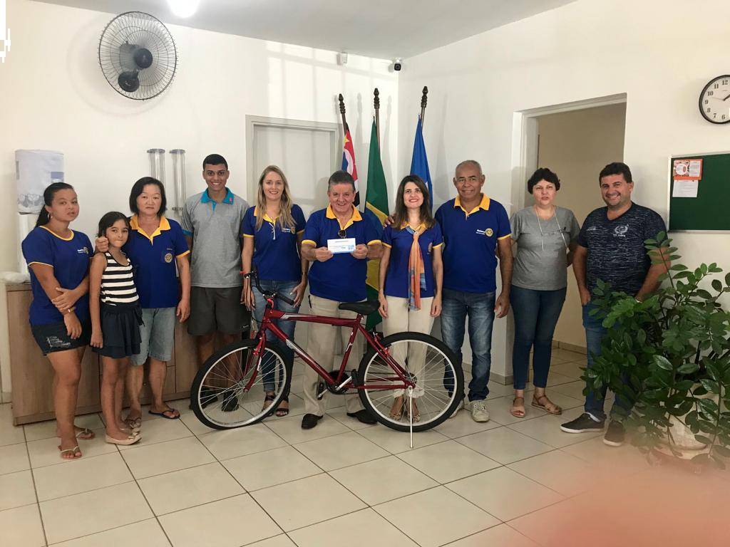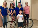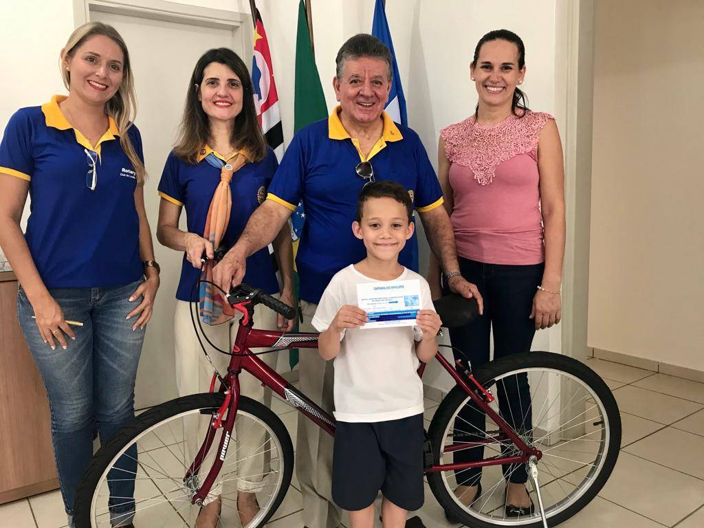 Finalizando, foi realizado o sorteio de uma bicicleta entre os alunos das escolas visitadas, que foi doada pela Loja Real Móveis e Rotariano Elias Fortunato tendo o ganhador o aluno Vinicius Henrique dos Santos, 2º B da Escola Carlos Bueno que foi receber a bicicleta com sua mãe Cristiane e a Diretora Patrícia Gonçalves Flores.