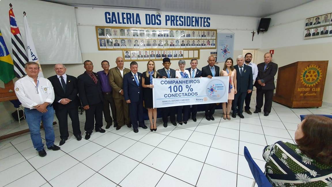 O momento foi registrado com a FOTO de exibição da faixa (banner) da campanha das metas do ano 2019-20, intitulada "COMPANHEIROS 100% CONECTADOS” da campanha “CONECTADO A FUNDAÇÃO ROTÁRIA”.